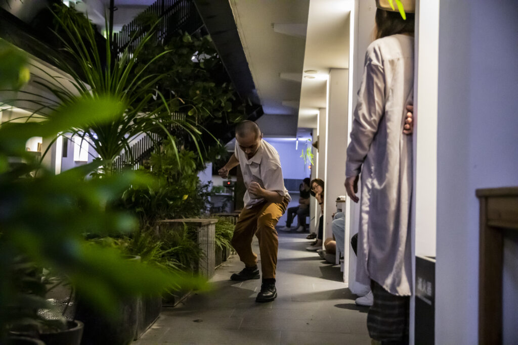 不能否認,《裂縫裡的光》無法推翻社會制度約定下的時間(否則大家很難聚在一起),職是之故,演出說明裡依舊有一張時間表。但是,當「入座、燈暗、演出開始」行禮如儀的觀演模式消失,當「開始」不以鐘錶刻度而以呼吸調停,當海邊晨間瑜珈、在地市場巡禮溢流於時間表之外,當愛麗絲夢遊仙境的兔子揣著懷錶凝視你,在你穿行於中介地帶(遊覽車、火車)、私人領域(房間裡)、公共空間(天井下)時,一場綿延纏繞的時空漫遊術便如藤蔓緩緩攀附,於焉展開。